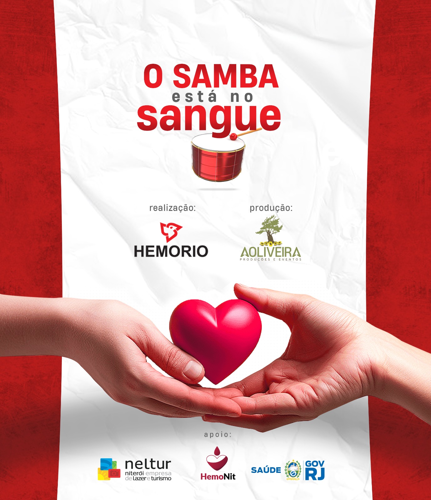 O mundo do Samba e do Carnaval de Niterói se reunirão nos próximos dias 31 de Outubro e 1º de Novembro, na campanha “Samba está no sangue”. Os doadores poderão participar se dirigindo ao Centro de Atendimento ao Turista (CAT) da Neltur (Niterói Empresa de Lazer e Turismo) no Caminho Niemeyer, das 10h às 15h.